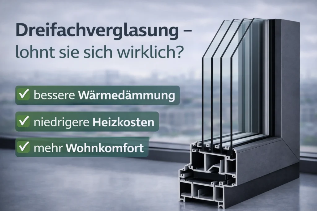 Moderne Dreifachverglasung verbessert die Wärmedämmung deutlich, reduziert Heizkosten und sorgt für spürbar angenehmere Oberflächentemperaturen im Raum. Entscheidend ist jedoch immer das Gesamtsystem aus Glas, Profil, Dichtungen und fachgerechter Montage.